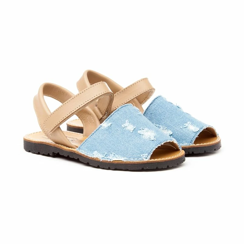Abarcas Menorquinas Niña Tela Vaquera Y Piel Velcro 212 Camel, de Angelitos
