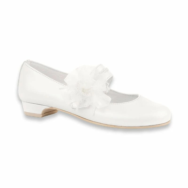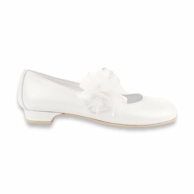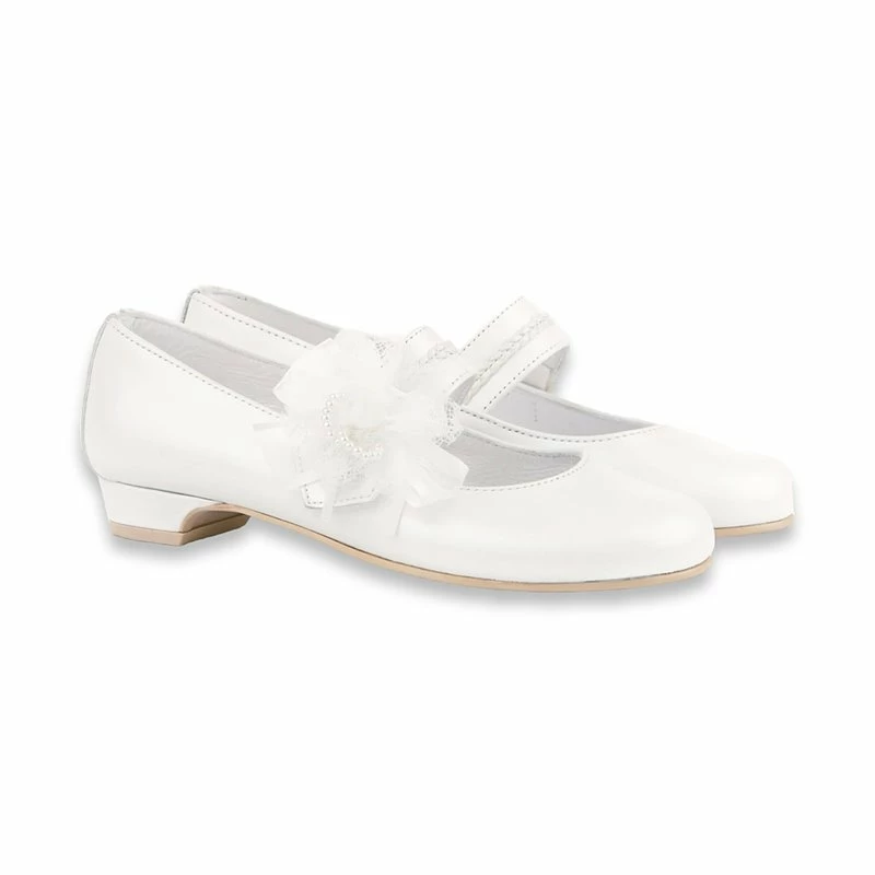 Merceditas Comunión Tacón Niña Piel Nacarada Flor Tul Y Perlas Velcro 997 Blanco, de Angelitos